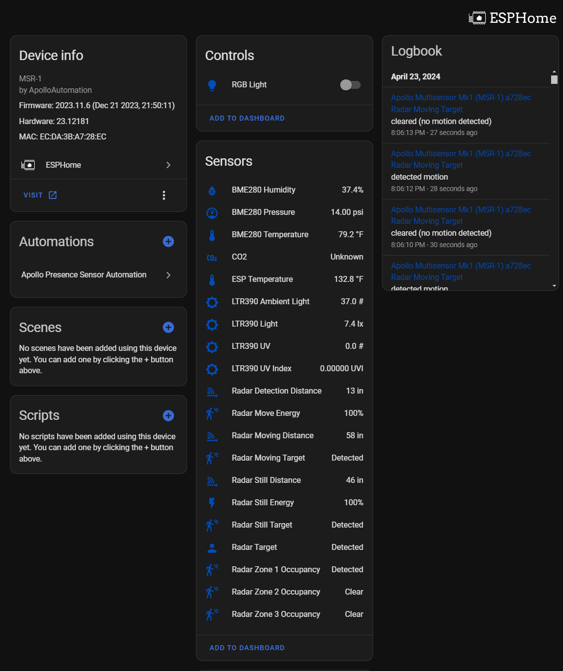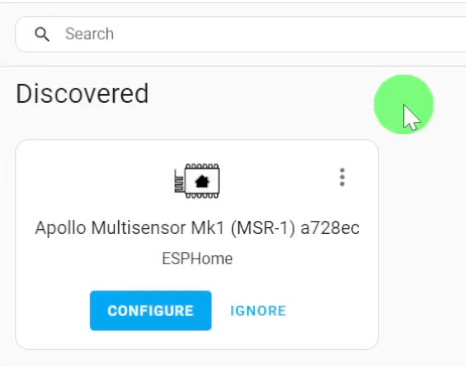 Adding to Home Assistant is as easy as adding most ESP devices that have a built-in wifi access point. Power up and attach to the "Apollo MSR-1" (or similar) access point. Once connected, head over to http://192.168.4.1 (if your browser doesn't automatically open to the page) and configure your wifi details. After doing that, Home Assistant should auto-discover the device. You'll need the ESPHome integration installed in Home Assistant of course.