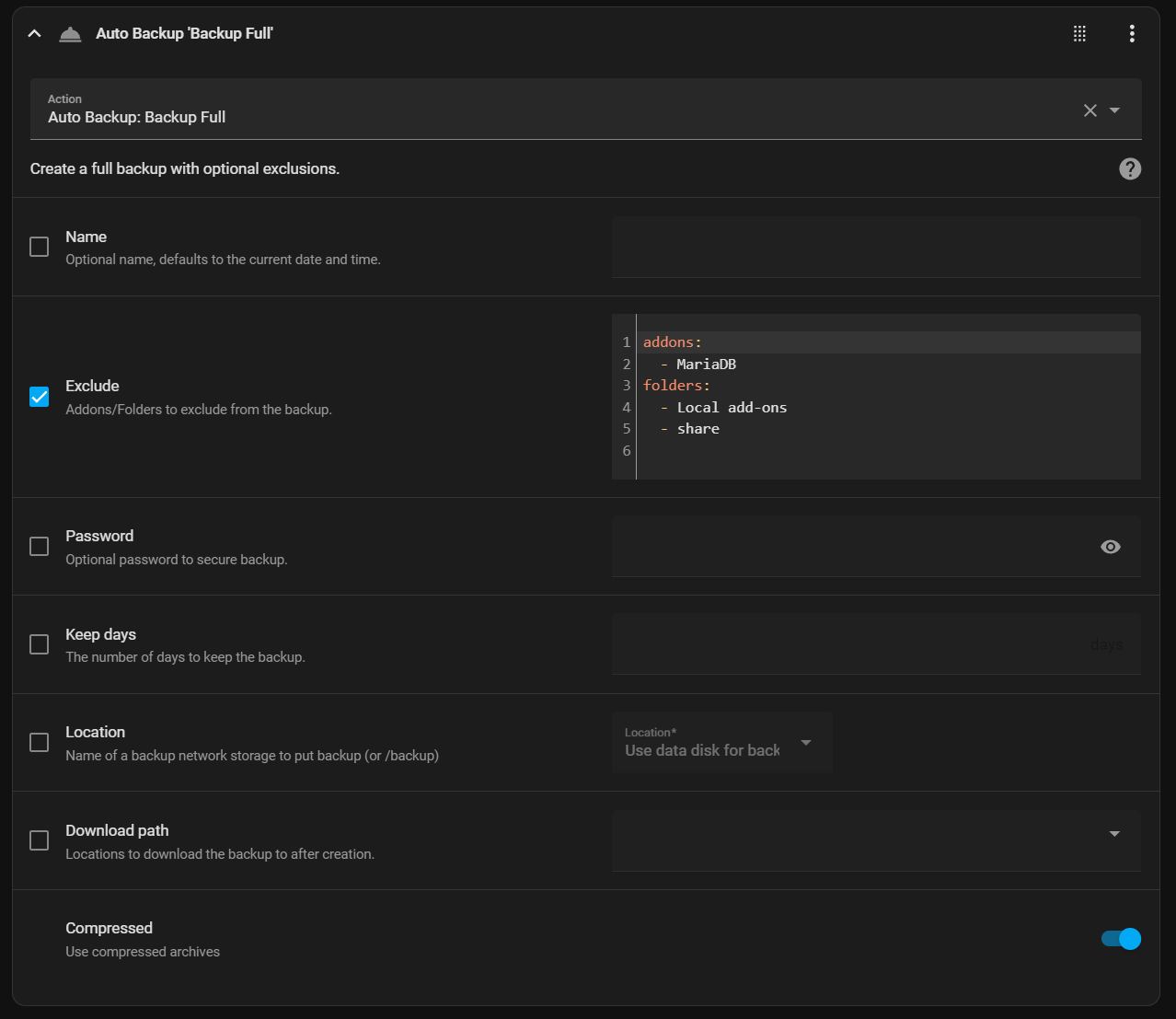 Auto Backup lets you take control of your Home Assistant backups and tailor them exactly as you need. It allows for the exclusion of add-ons and folders and allows the deletion of expired backups. Finally, it allows you to create long-term generational backups. All this through simple automations. Give it a try for yourself!