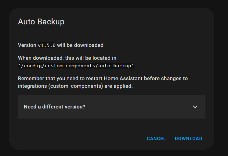 Installing Auto Backup is just like installing any other HACS integration. From the Auto Backup website, there is an "Add Integration To..." button. However, I prefer to install it manually.