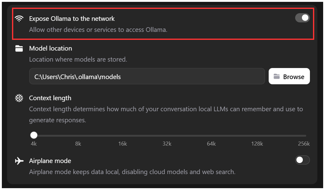 Frigate configuration for Ollama is designed to allow connection to a local instance of Ollama. Running the client as I was doing serves this purpose, even when using a cloud model. One thing you need to set is to allow remote access to the client by toggling the "Expose Ollama to the network" option in the client.