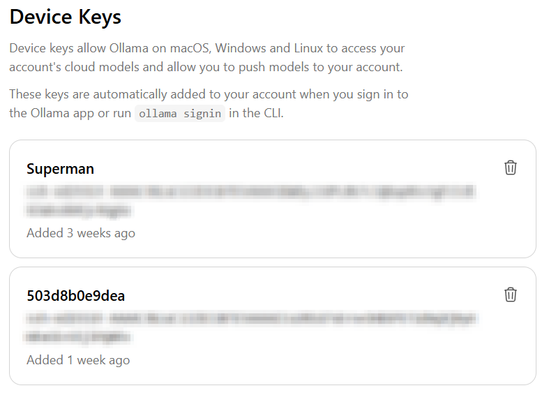 ollama signinFollow the prompts to authorize that machine. You should have the device show up in your Ollama account on the keys page under Device Keys.