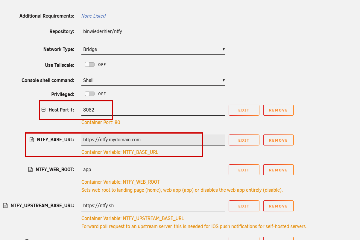 During the install, you will get the standard options screen that you see in many UNRAID installs. I had to change a few things. First, the default port was already in use so I changed to 8082, and I also provided a full URL that will be the base for the app.