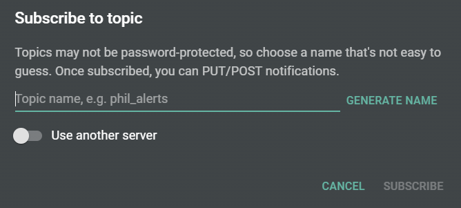 You will get a popup asking you to provide a topic name or you can click the Generate Name button to have it create a topic name for you. Once you have a name, click on Subscribe and ntfy will now be listening for events sent to that topic. You should see the topic name under Subscribed Topics on the left.
