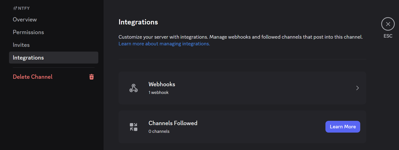 For Discord, I went into my Discord server and created a private channel. In that channel, under Integrations, I created a webhook.