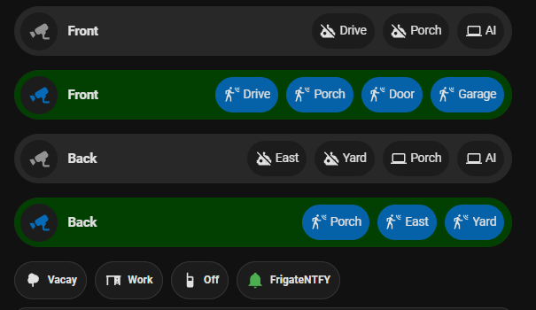 In the image below the gray bars are automation toggles that are using Home Assistant blueprints for Frigate notifications. The green bars are detection settings for each camera via MQTT. The idea is to decouple Frigate alerts from Home Assistant but still be able to control them easily from a dashboard. I know that will make some of you crazy. I want my cake and eat it too. What this DOES do, is keep you from having to install any frigate or frigate proxy stuff in Home Assistant, HA is just a control front-end for the alerts.