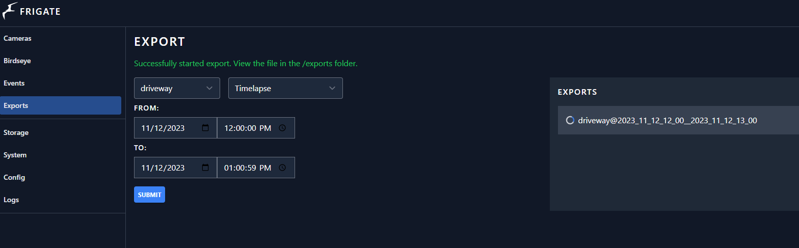 - It is now possible to export recordings either as a regular speed video or as a time-lapse based on user-selectable time/date ranges. You can download and manage those exports directly from the UI. Getting a timelapse of a specific time was always problematic and required that I stitch together tens or hundreds of small video files into one big file. The export feature solves this.