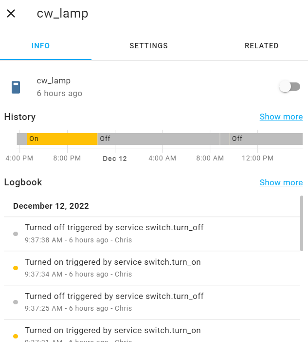 In addition to the colors on the tile cards, the logbook and history have also been updated to reflect the same color schemes used for the entity states in the tile cards. The yellow below reflects the "on" state of the lamp, which is the same yellow that appears on the tile card when the lamp is on.
