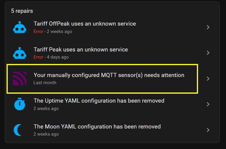 The MQTT specific entry is telling me that my MQTT sensor(s) need attention.