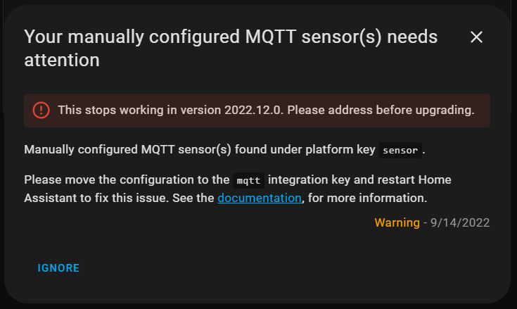 Looking at the image above, there is a dire warning that my manually configured MQTT sensors will stop working in version 2022.12.0. As of this writing, that gives me a short timeframe to get things fixed. There is an option to ignore this alert and it will go away quietly. As I rely on quite a few MQTT-based sensors and devices, it is important that I take care of this or my smart home will be a little less smart, so ignoring is not an option.