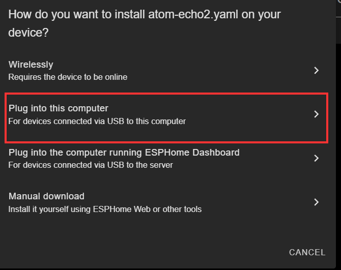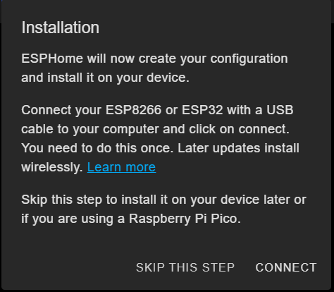 I will be programming this initially by connecting directly to my computer. This is a handy feature that was added to ESPHome and makes it easy to get your code onto devices directly from your PC. You can choose two routes at this point, either "SKIP THIS STEP" or "CONNECT". If you want to simply create a new device so you add the necessary code, click on skip and then you can upload and program the device all at once. If you would rather just get the basic code onto the device and set your Wi-Fi credentials, click Connect.