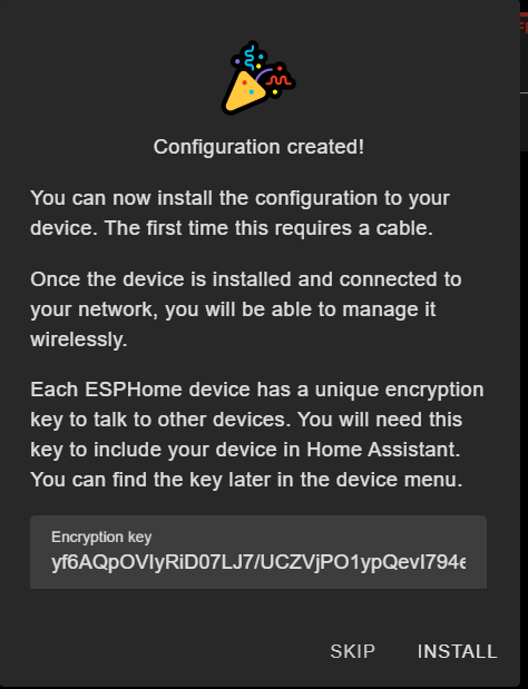 I am going to opt for skipping and adding all the relevant code first. Once you click on "SKIP THIS STEP", you will be asked what device type. Just choose ESP32 and then you will be presented with an encryption key. That key will be in the configuration file that is now created so you can ignore it for now (you can also copy it down and save it for later if you want). Just click "SKIP" on that screen.