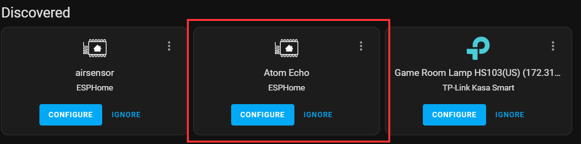 Once everything is working, Home Assistant will automatically discover the device on the integrations page. You will see the notification in the sidebar and clicking on "Check it out" will take you to the integrations page. You can also go directly to the Settings->Integrations page. On that page, click CONFIGURE for the device you want to set up. If asked for the encryption key, you can get it from the device config.
