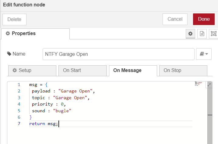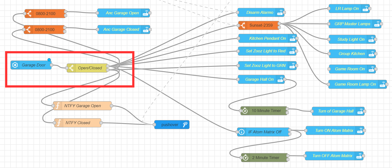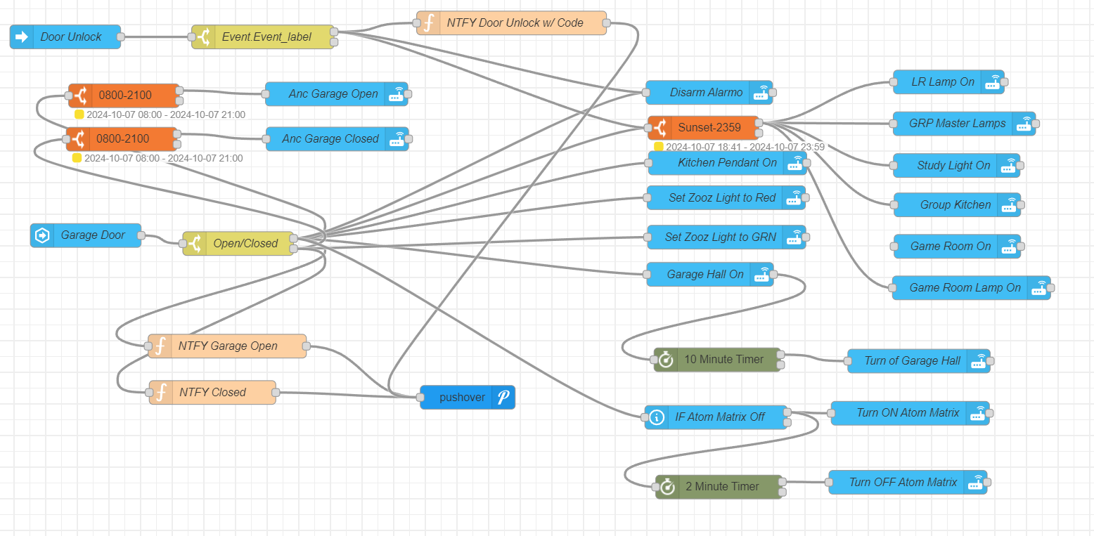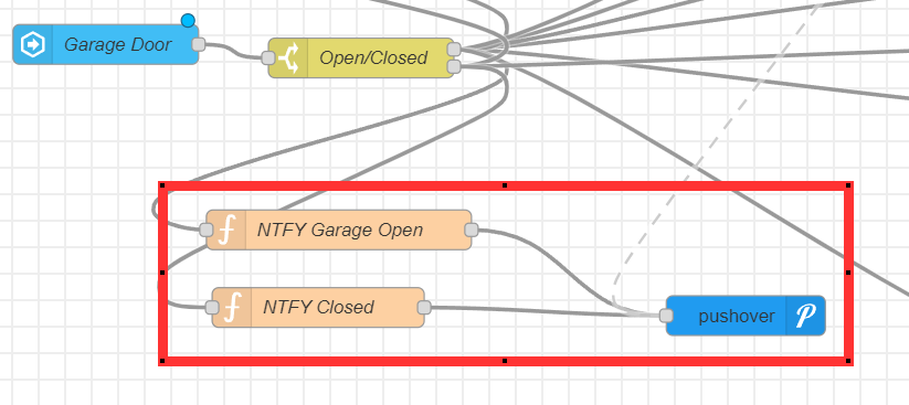 I send a notification to Pushover for either of those two events. Notice the function nodes that contain JSON code for the notification parameters.