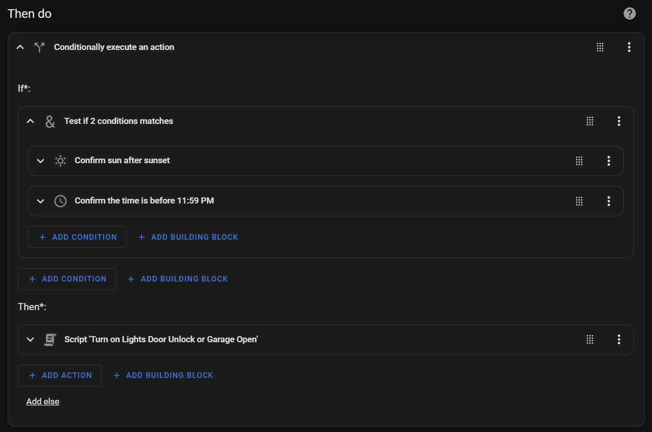 This part of the automation is what turns on specific lights between sunset and 11:59 pm. It does this by using an if-then building block to determine if the time is in my required window and then calling the script (I can't remember WHY I used a script here instead of just adding the actions directly).