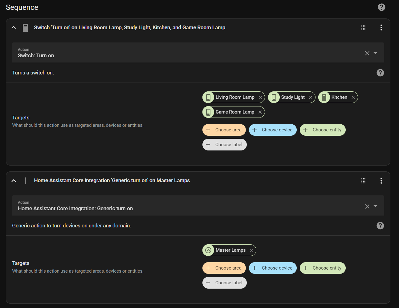 Many times, there is more than one way to do something in an automation. When I initially built this automation, I ended up adding a condition that would turn on a script. I could have easily just added actions directly, without using the script.