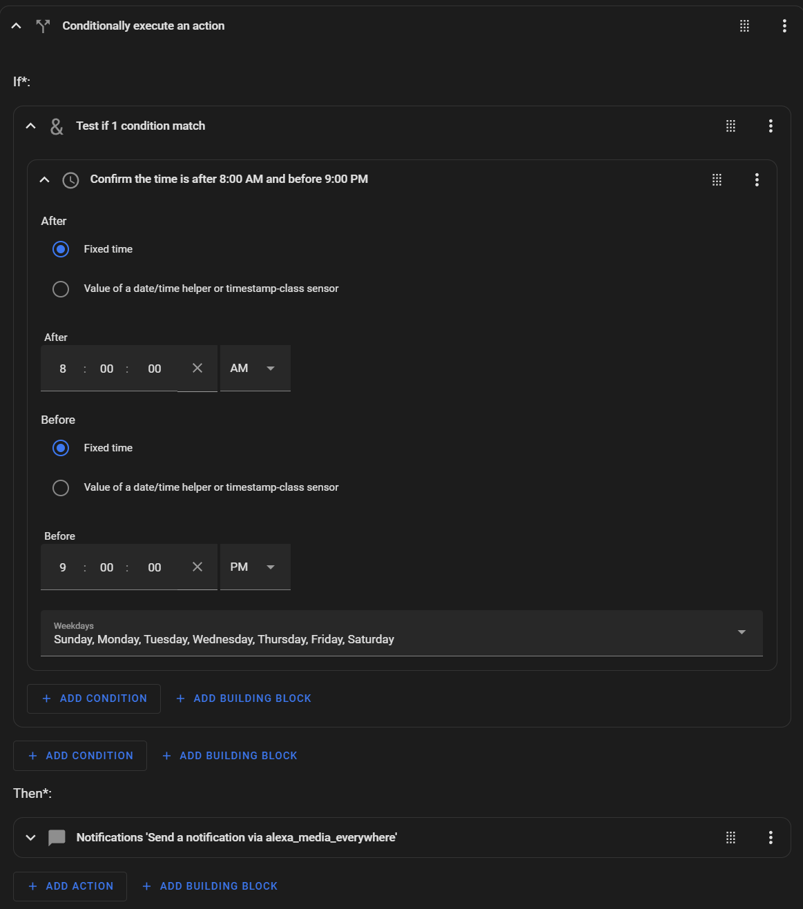 To only send announcements during a specific time, I use an if-then building block and choose a fixed start and end time as well as the days of the week I want this to run.