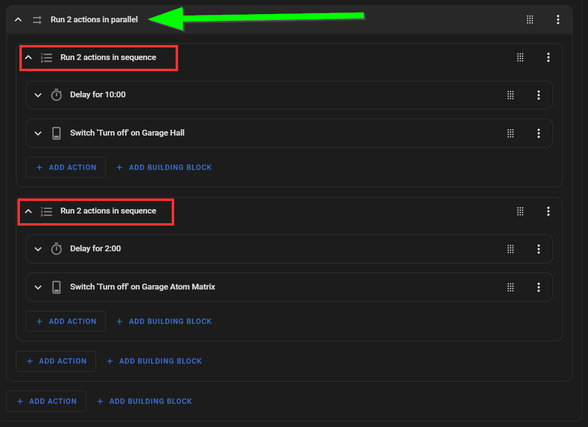 For the parallel timer block, I create two actions that both execute a sequence action. This is necessary because otherwise, all actions you put into a parallel building block will execute at the same time. I want the timers to start and THEN turn off the switches at the expiration of the timer.