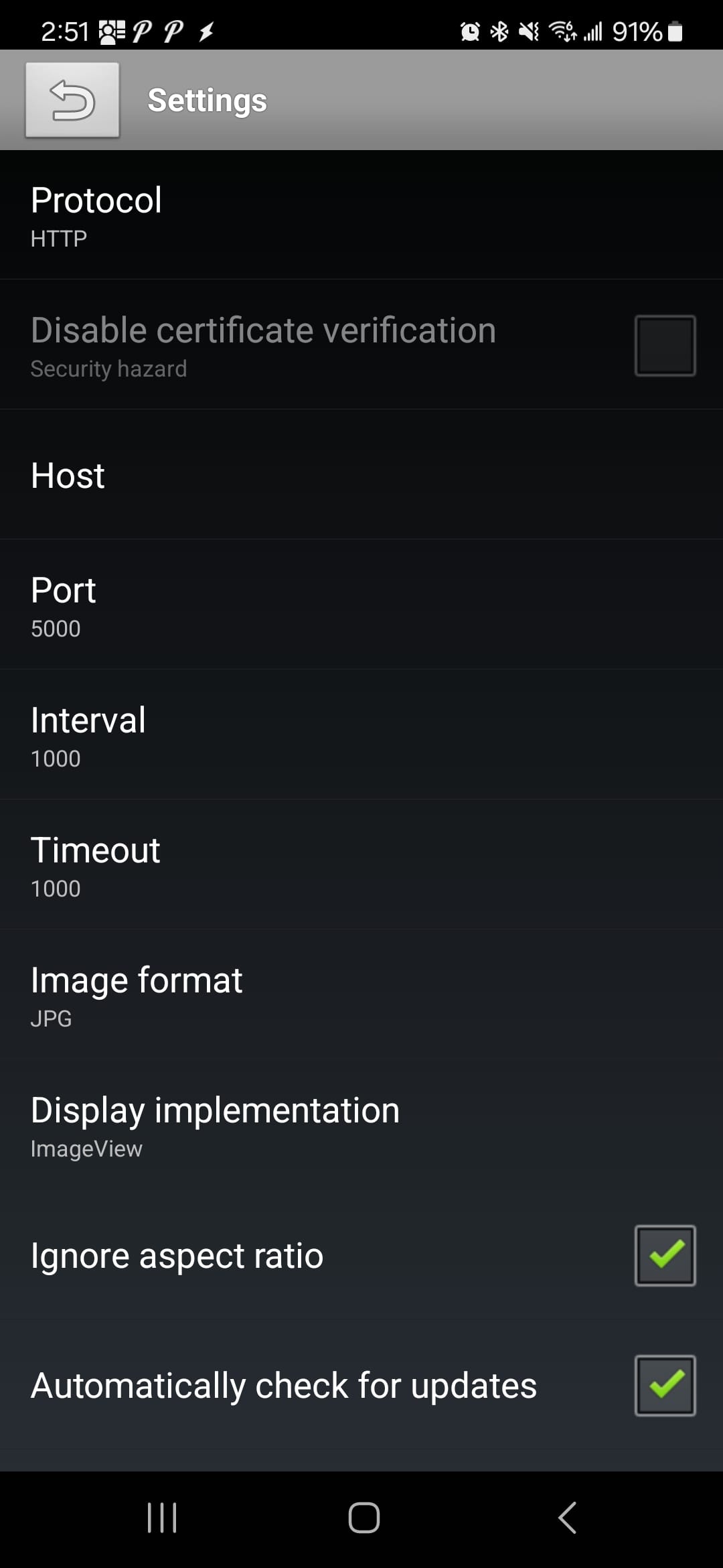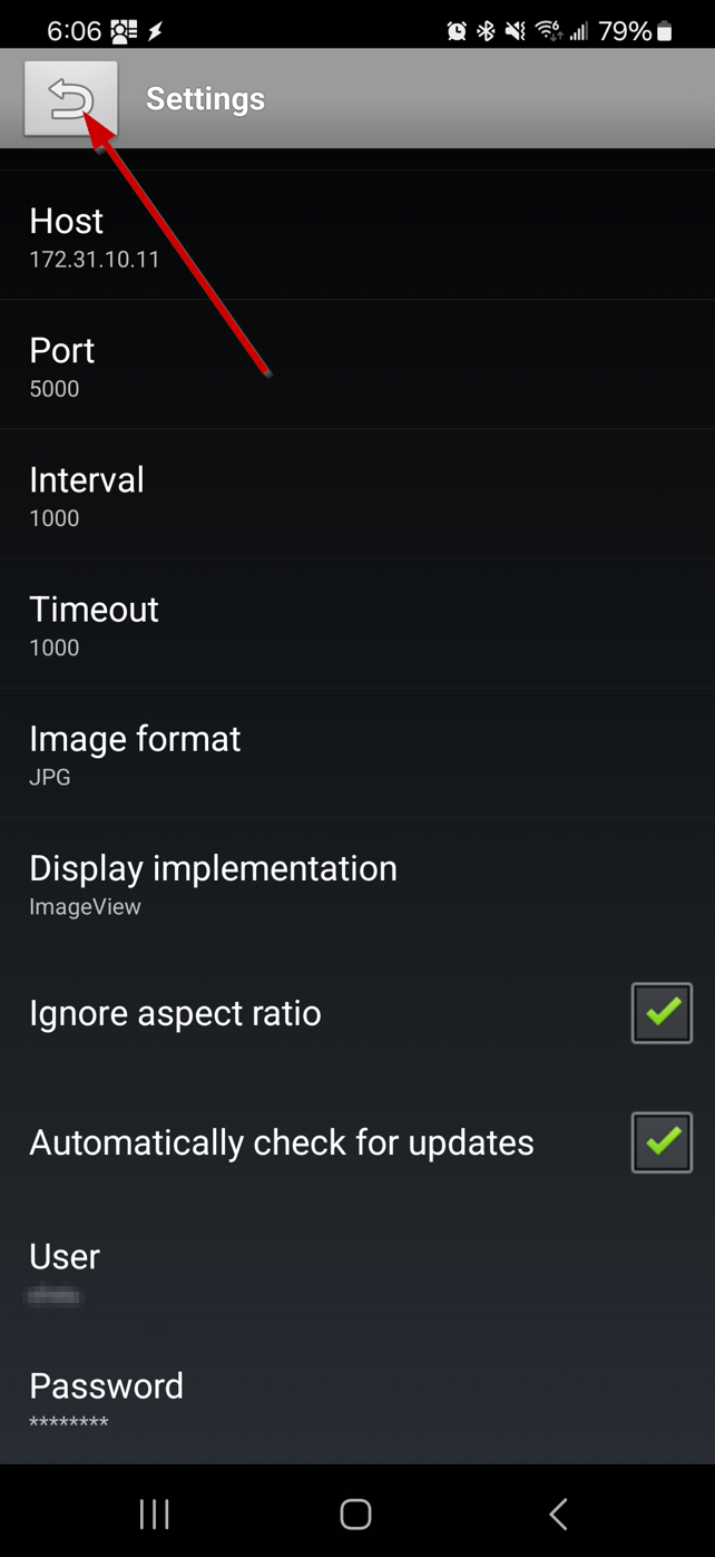 If your Frigate server requires a user and password, make sure to fill that out as well. You will need to scroll down in the settings window to see those options. When you have all the settings configured, use the back arrow to go to the main camera viewing screen.