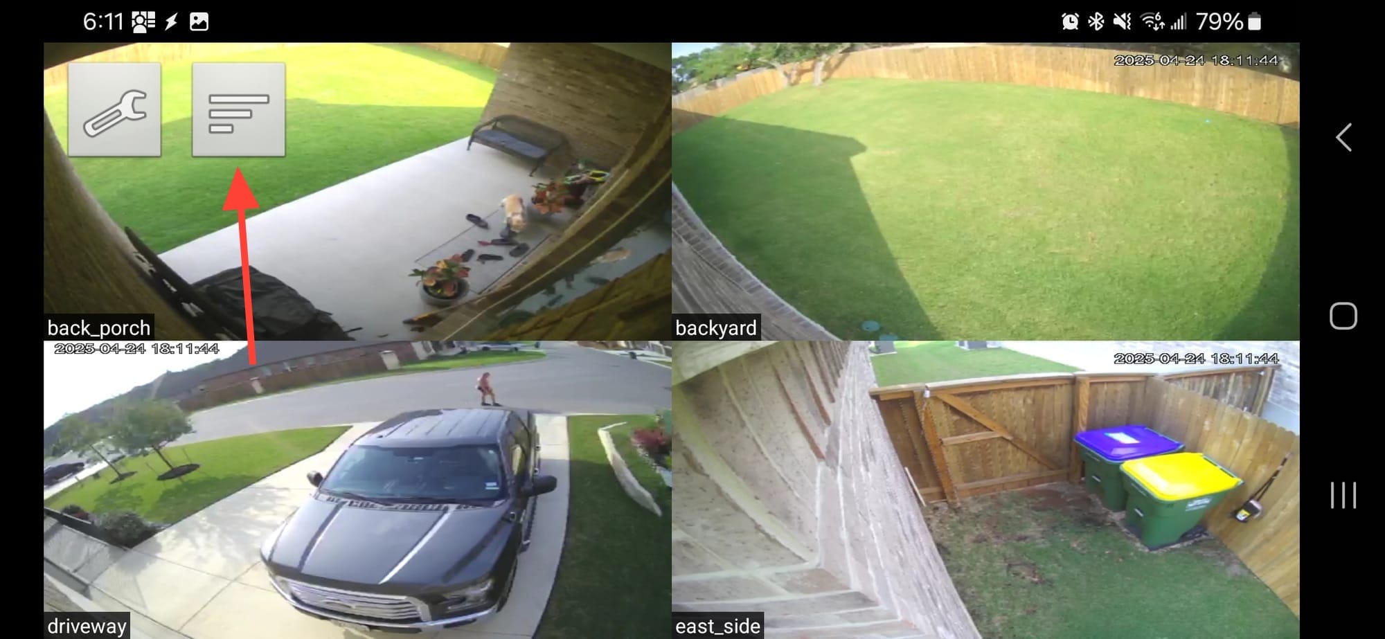 When you first run Periscope after configuring it, it defaults to four cameras. I don't know the logic it uses to choose them, but it doesn't really matter as you can choose whatever cameras you want to display. Tap the screen and it will bring up the settings (wrench) and camera list (lines) option buttons.