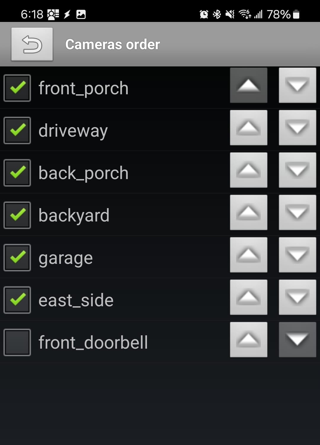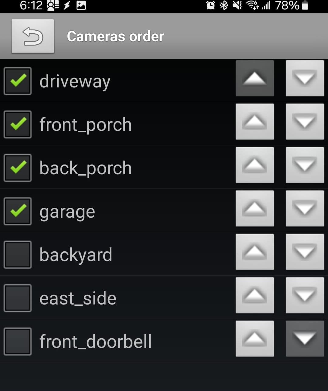 Click on the camera list button and you will see a list like below. In that window, you can choose which cameras to display and use the arrows to raise or lower them in the order of appearance on the live view page. As of this writing, when first going to this page, nothing is selected, even though some cameras were displaying by default. You will need to choose at least one camera.