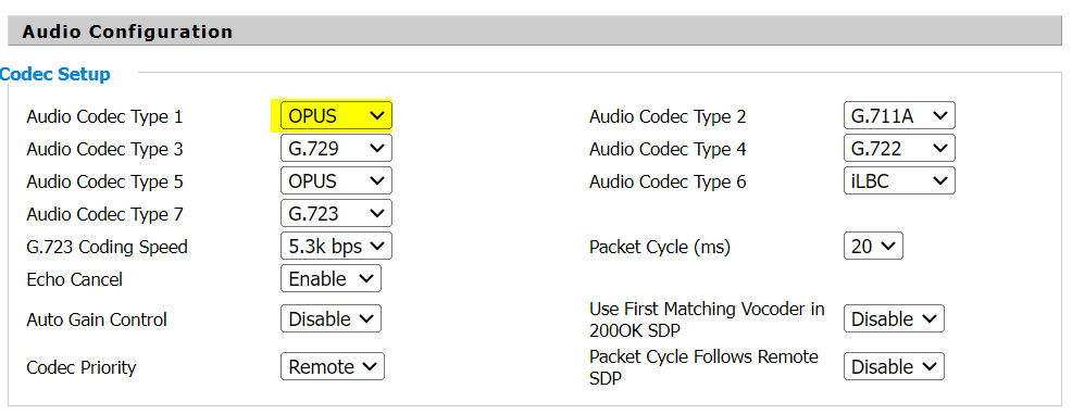 The Audio Configuration section only requires that you select "OPUS" as the primary audio codec.