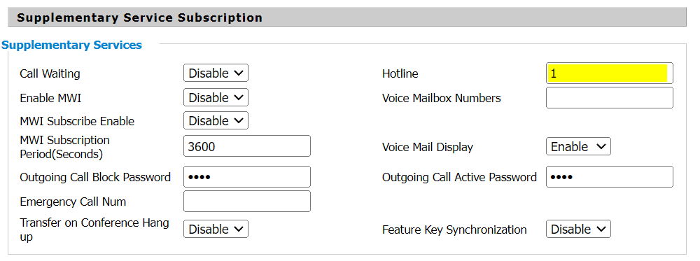 The final section (for this phone) that requires configuration is the "Supplementary Service Subscription". This is where terminology might be quite different between the various phones and phone brands. For my phone, there is an option called "Hotline". If I place anything in that field, the phone will immediately dial those digits when I pick up the phone. It really doesn't matter what you put there. However, I would just put a single digit to make things faster. If you were to leave the hotline blank, you would have to dial a digit after lifting the handset to make it dial out to Home Assistant.